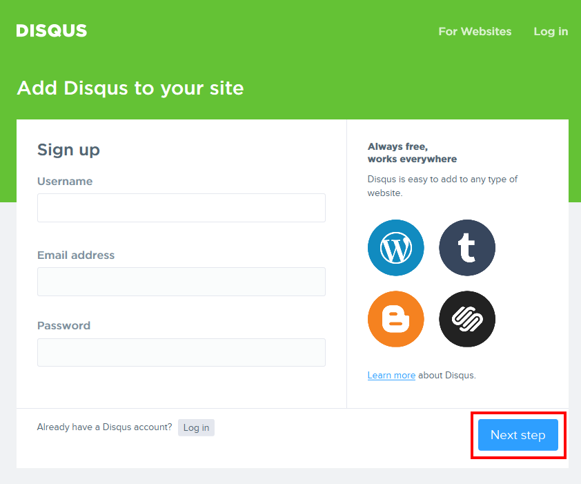 Bagi yang sudah buat akun langsung login saja, bagi yang baru pertama kali menggunakan disqus isi semua kolom yang dibutuhkan lalu klik Next Step.