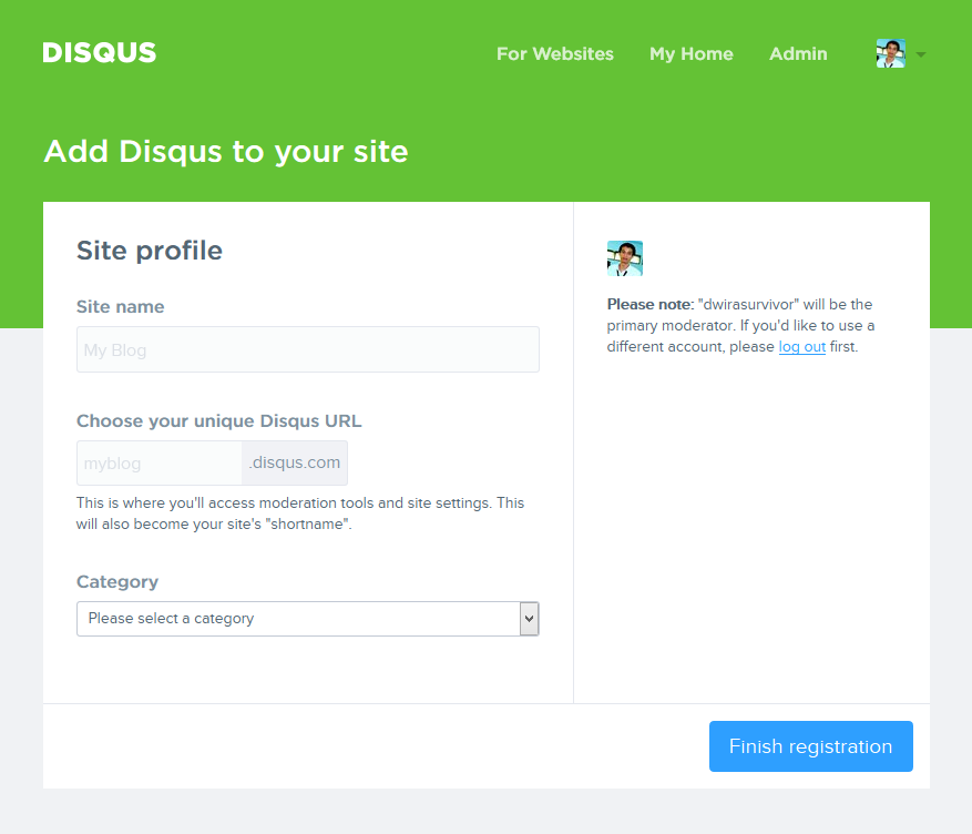 Isi kolom Site Name dengan nama website Anda, lalu kolom Choose your unique Disqus URL akan otomatis terisi saat diklik. Pada kolom Category, pilihlah yang sesuai dengan konten website Anda, jika tidak mewakili satupun, pilih saja Other lalu klik Finish registration.